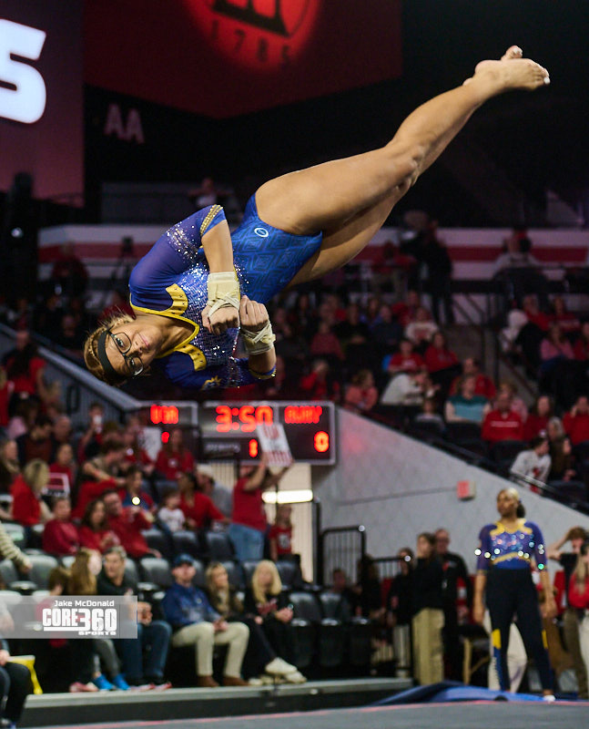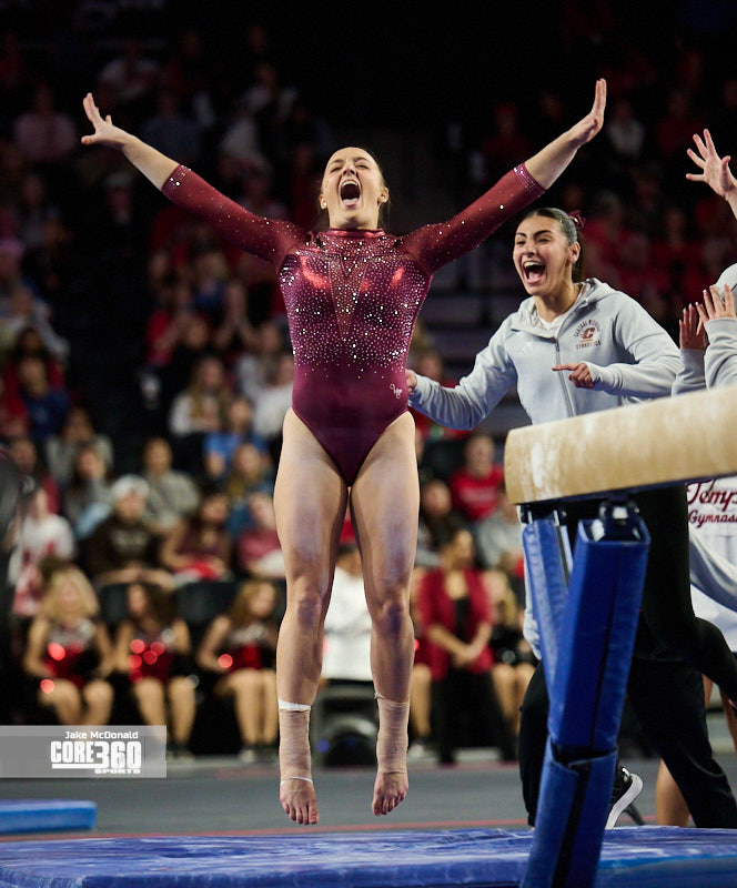 Temple was led by Amelia Budd’s 9.825 on the vault. Budd had the fourth-best score on the apparatus. Reese DeHaan, Brooklyn Thomas, and Nikki Rengifo posted 9.775 scores in the unbalanced bars, floor exercise, and vault.