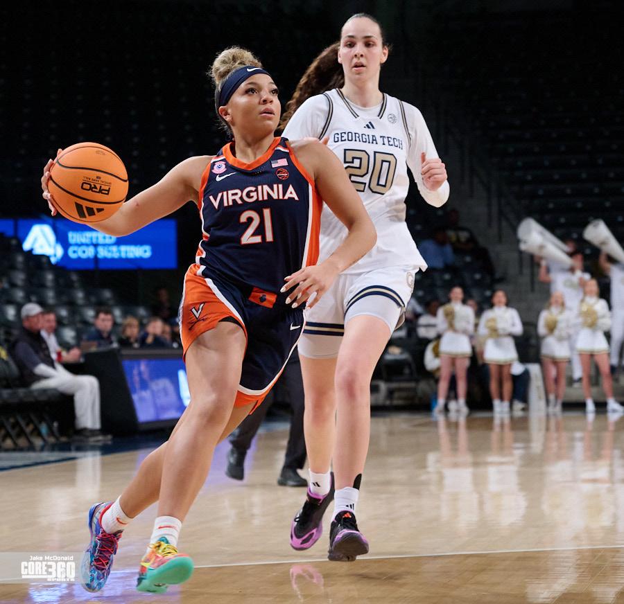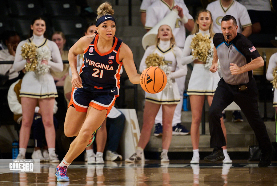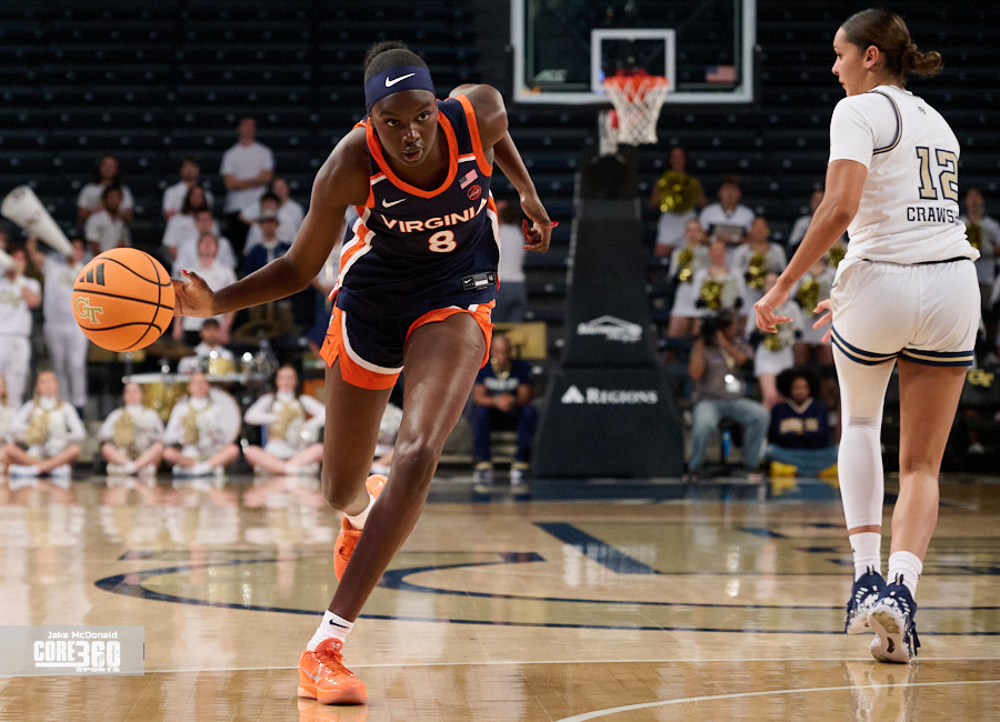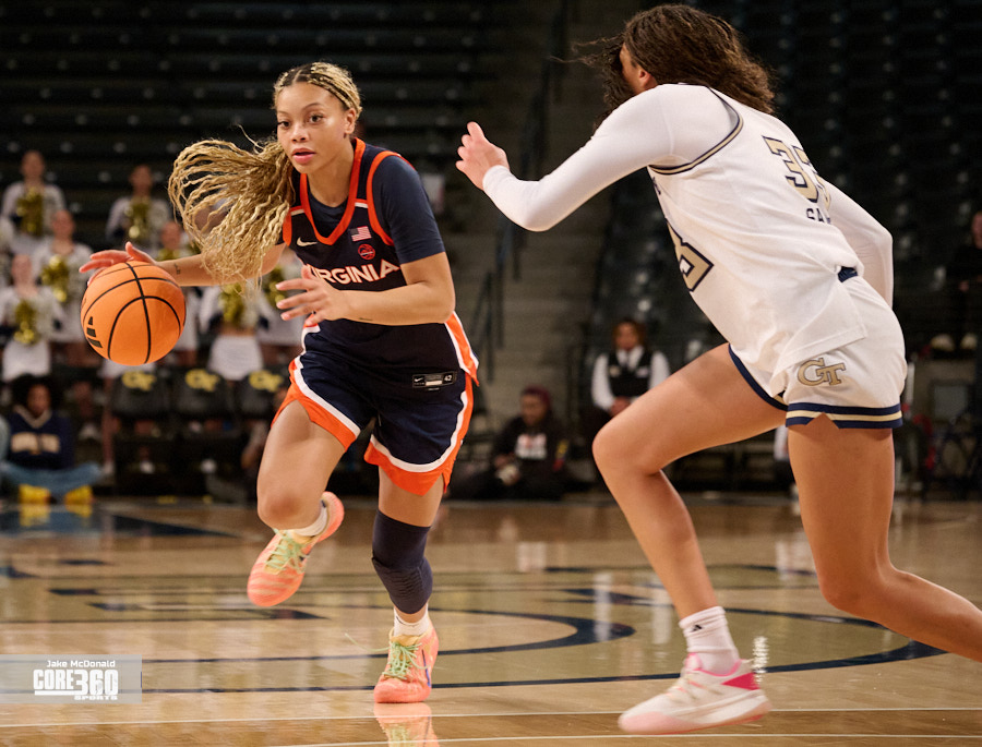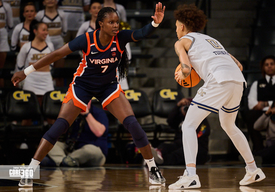 Virginia guard Jillian Brown came up with the biggest stop of the night on Georgia Tech’s leading scorer Talayah Walker to clinch a 61-59 victory on the road in Atlanta.